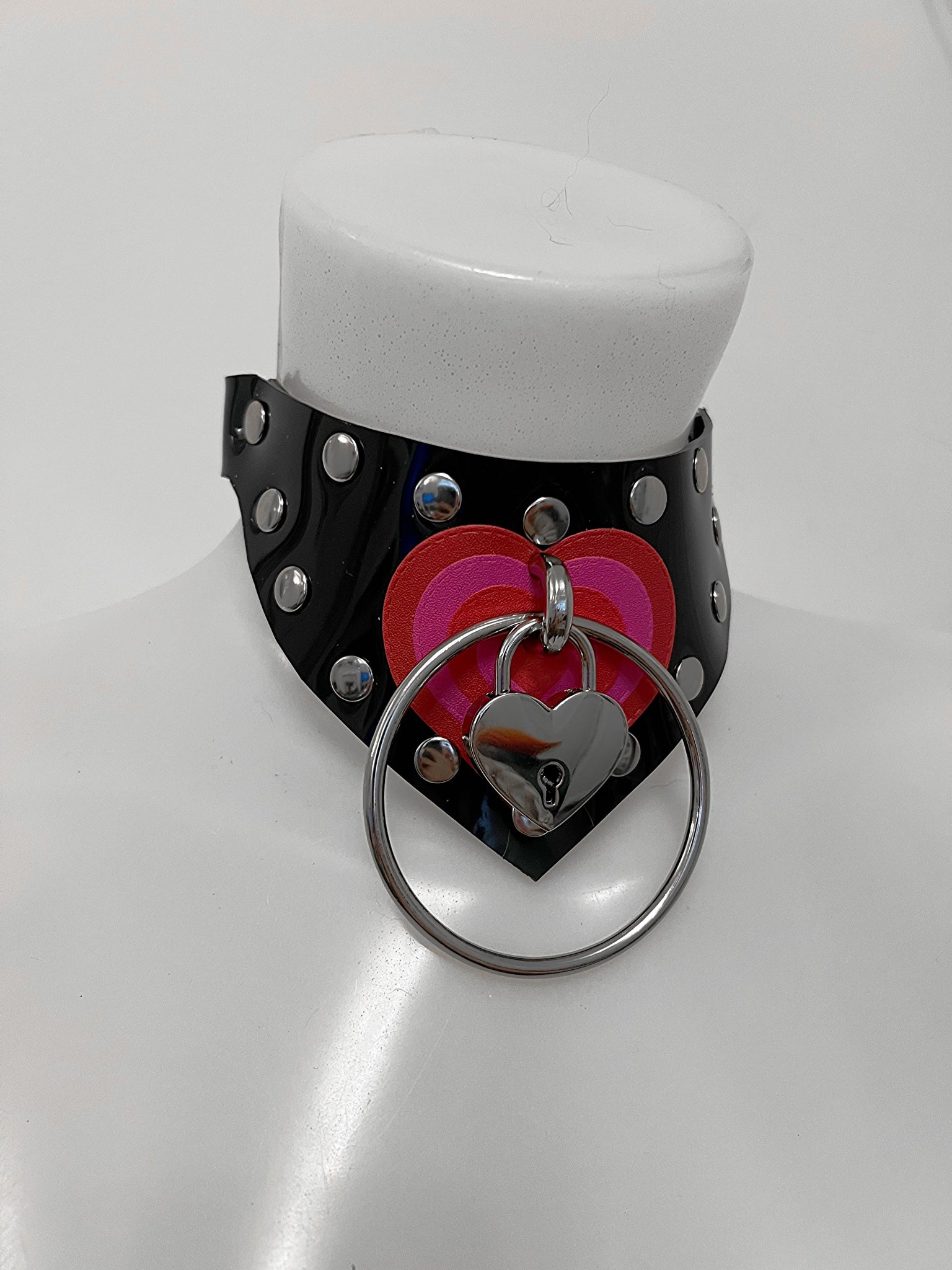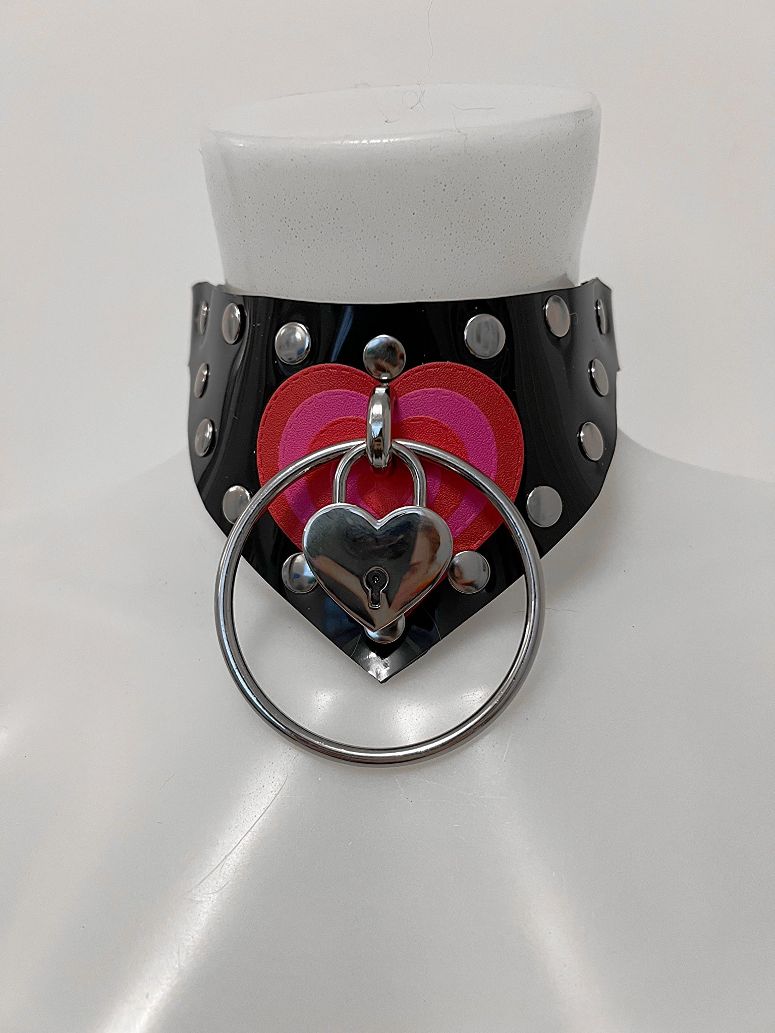 Hand cut pvc choker with vinyl heart details and padlock / o ring hardware