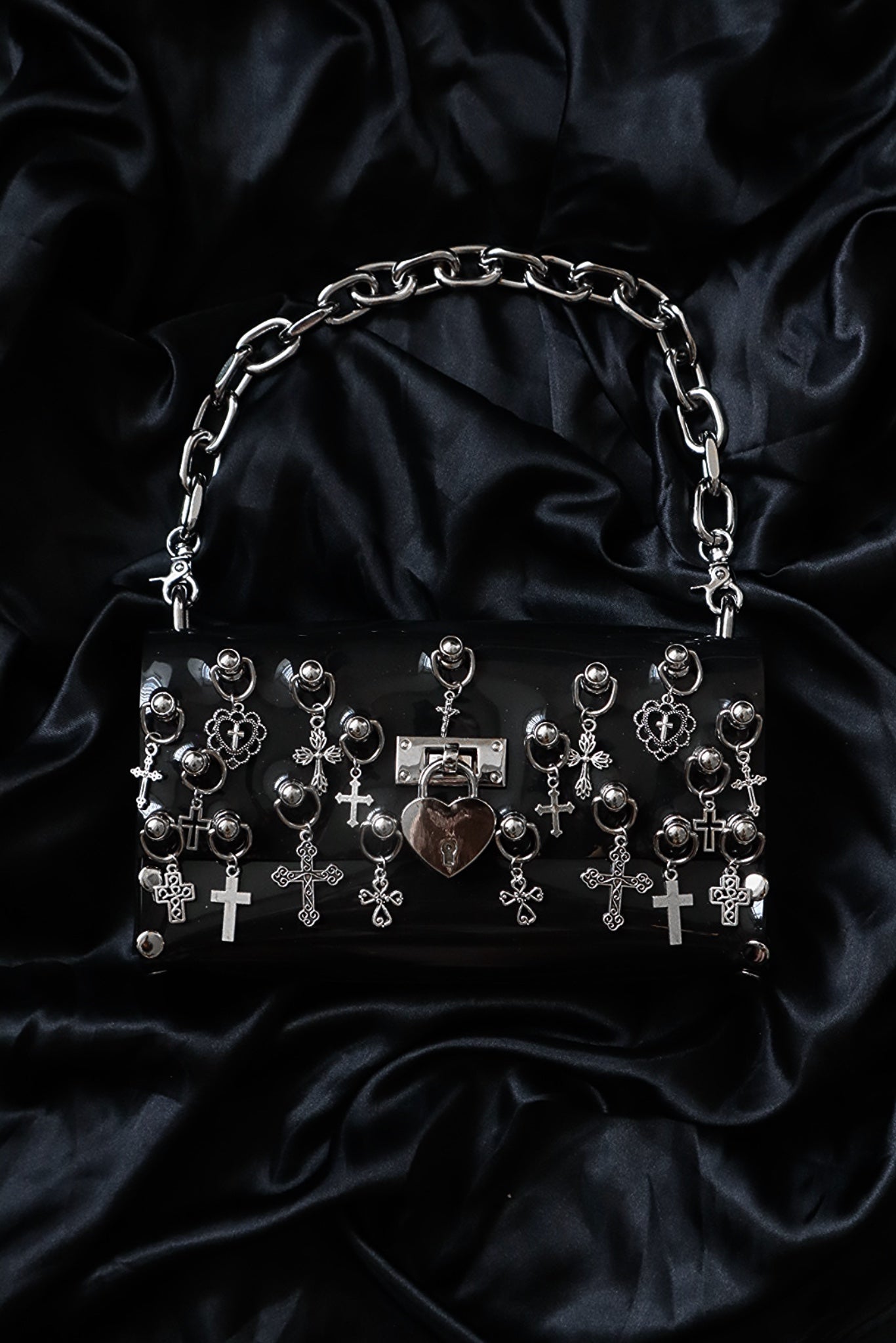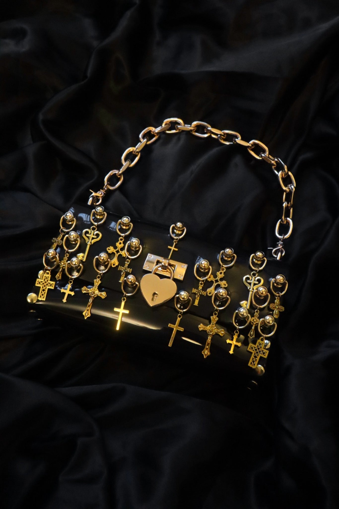the bag comes with 2 lengths of detachable chains for over the shoulder wearing or more of a clutch style